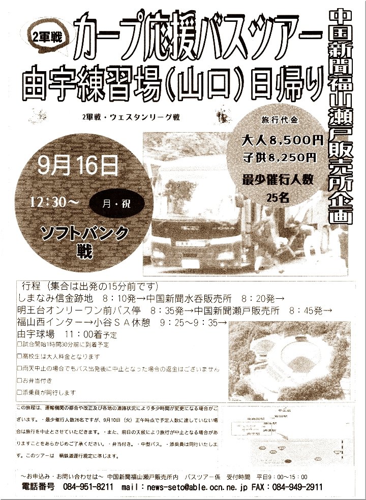 にも関わらず、今朝も折り込みチラシからチェックしておりますと、うん、うん、入っておりましたネ。「2軍戦・カープ応援バスツアー」のご案内が(^_^)v