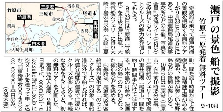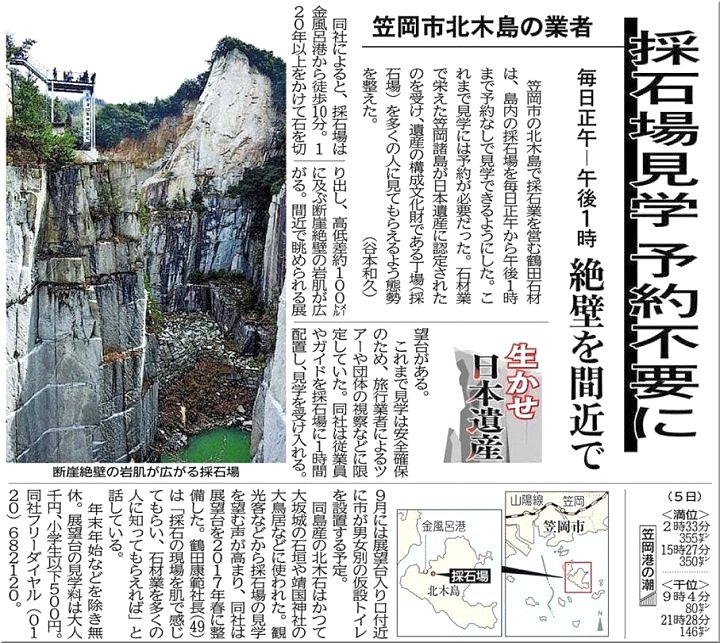 これは、9/4(水)の中国新聞sanの記事なんですけど、北木島(笠岡市)の採石場見学に予約不要とは嬉しいですねぇ(^.-)☆