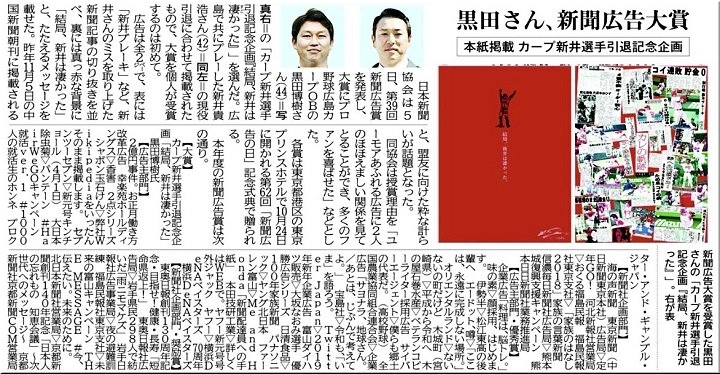 黒田元投手が依頼者でありますこの新聞広告が「第59回新聞広告賞・大賞」に選ばれましたとは…カープファンにとりましては、また嬉しいニュースとなりましたネ\(^o^)/