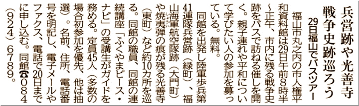福山市内の「戦争史跡巡りバスツアー」の開催案内ですけど、う〜ん、9/29(日)の開催とは残念(^-^;