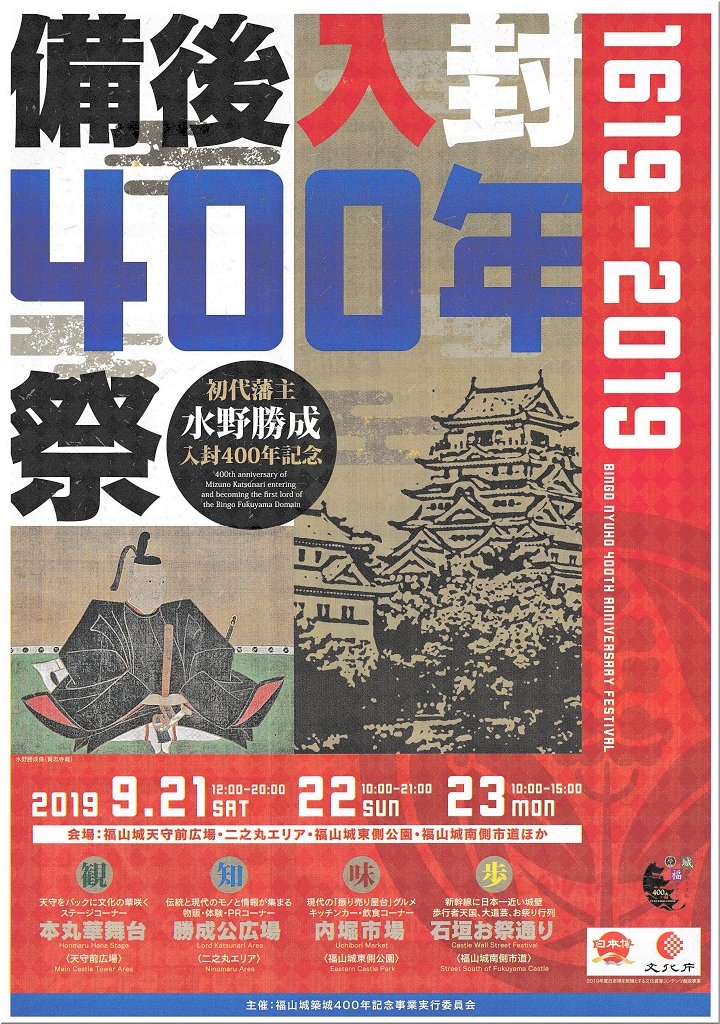 9月22日(日)、23日(月・祝)の「備後入封400年祭」は台風接近に伴い、開催に支障が生じる雨量等が見込まれるため、中止とします。
