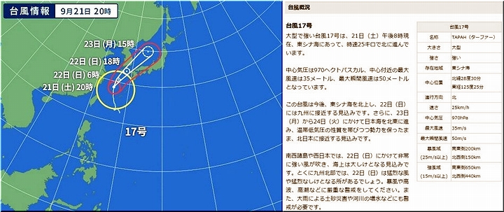 大型で強い台風17号は、21日(土)午後8時現在、東シナ海にあって、時速25キロで北に進んでいます。