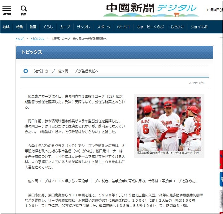 ふ〜ん、緒方監督の後任は佐々岡コーチが就任なのですねえ(^.-)☆