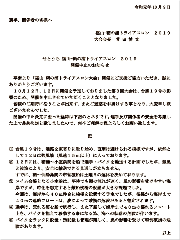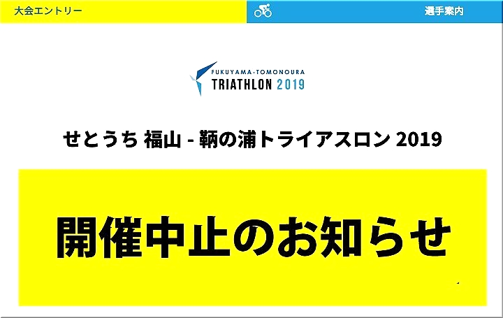観戦を楽しみにしておりました『せとうち 福山−鞆の浦 トライアスロン2019』が、台風19号接近で中止となりましたようですネ。う〜ん、残念(^-^;