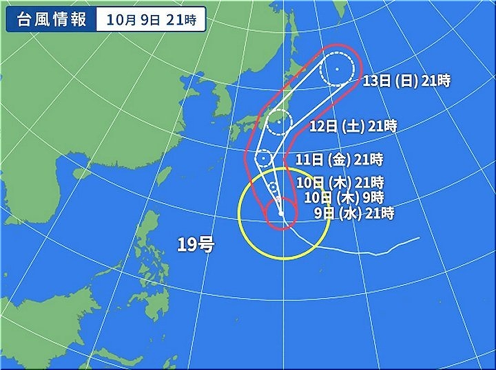 大型で猛烈な台風19号は、9日(水)午後9時現在、小笠原近海にあって、時速15キロで北北西に進んでいます。中心気圧は915ヘクトパスカル、中心付近の最大風速は55メートル、最大瞬間風速は75メートルとなっています。