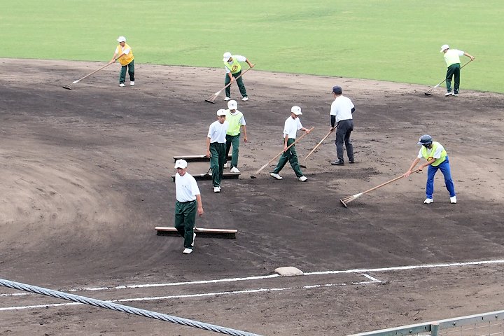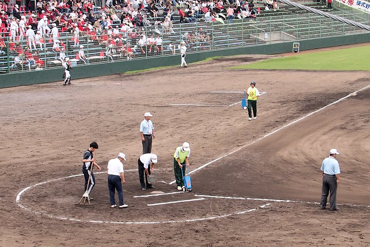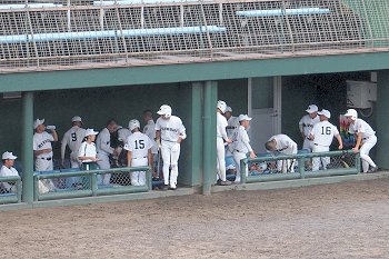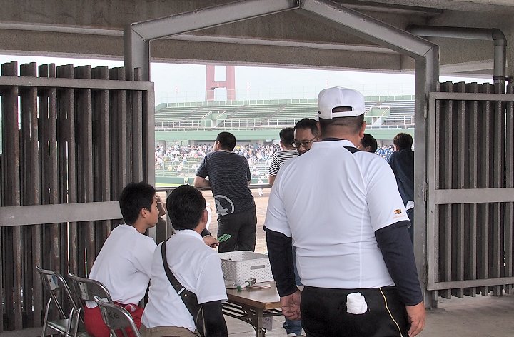 降雨もどぅやら治まりましたようで、グランド整備の間にGONsanはネット裏に移動し観戦となりました。