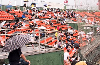 周辺を見廻しますと、まだ傘をさした方もチラホラ。んっ!?…と空を見上げますと、時折り小雨が…この程度でしたら暑くもなくて多少の涼しさもあり観戦には丁度良いかも(^.-)☆