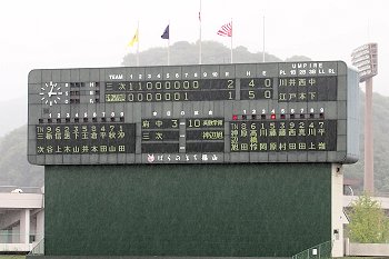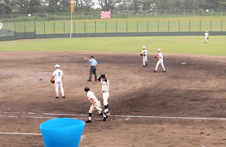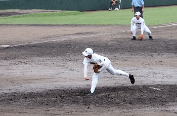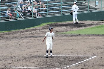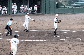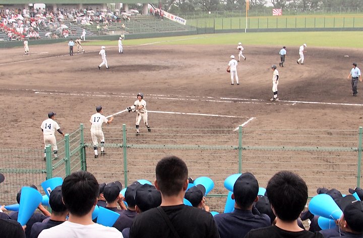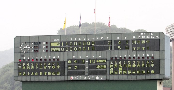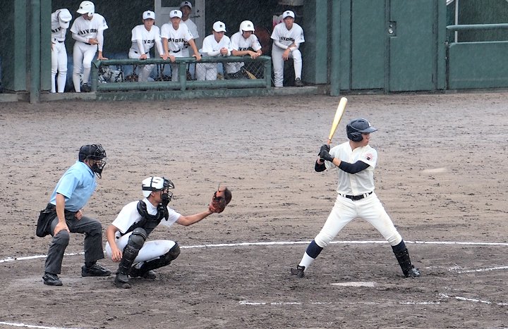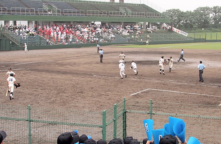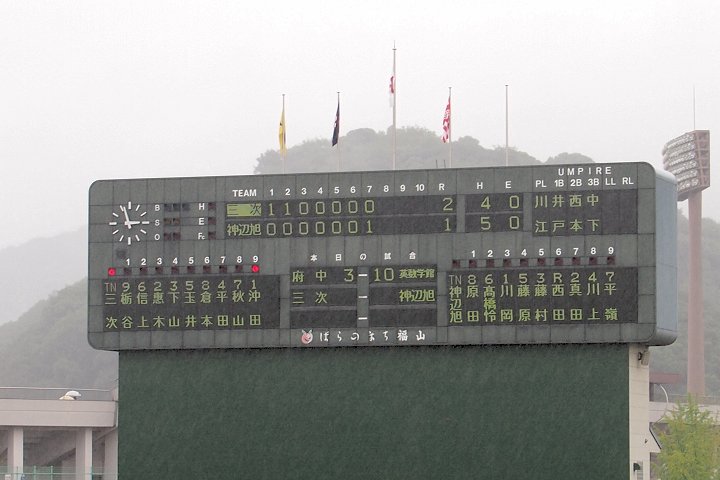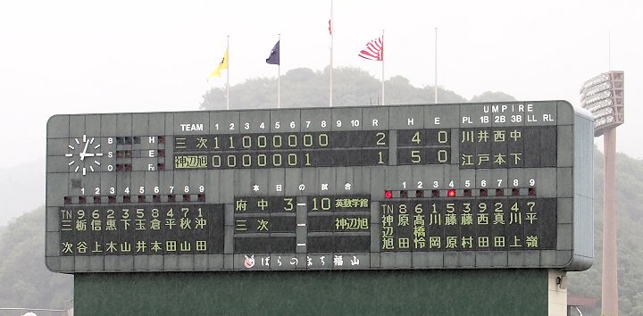 まだ1点リードの三次高校の8回の攻撃は、追加点ならず。回も残り少なくなって来まして、三次高校は1点差を守り抜くことが出来ますでしょうか…依然として、小雨は続いています福山市民球場。