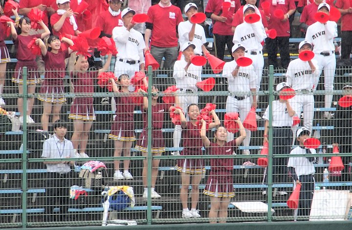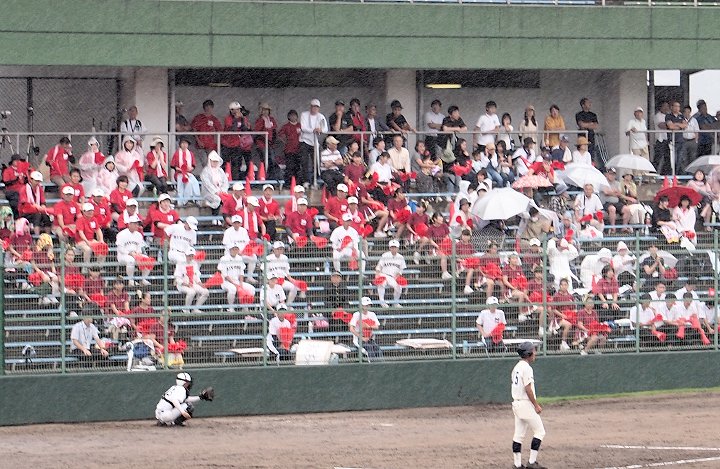 チャンス到来で、応援にも熱がこもります神辺旭の応援団。ラッキーセブンの神辺旭。1点を返し、そして同点にとなりますのでしょうか…