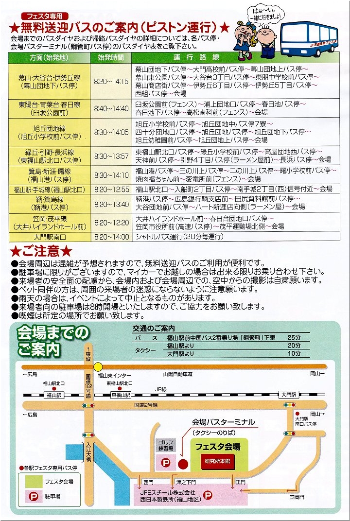 今朝の朝刊折り込みチラシの中に入っておりました「JFE西日本フェスタinふくやま」の開催ご案内のチラシ。う〜ん、そぅ言えば、福山で開催の大概のイベントには出掛けていますGONsanなんですけど、このJFE西日本フェスタには一度も出掛けた事がありません。