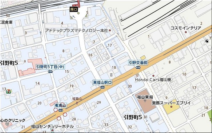 マップで場所の説明を致しますと、交差点角に福山センチュリーホテルが存在します交差点。マップに表示の赤○辺りを捜しておられましたネ。