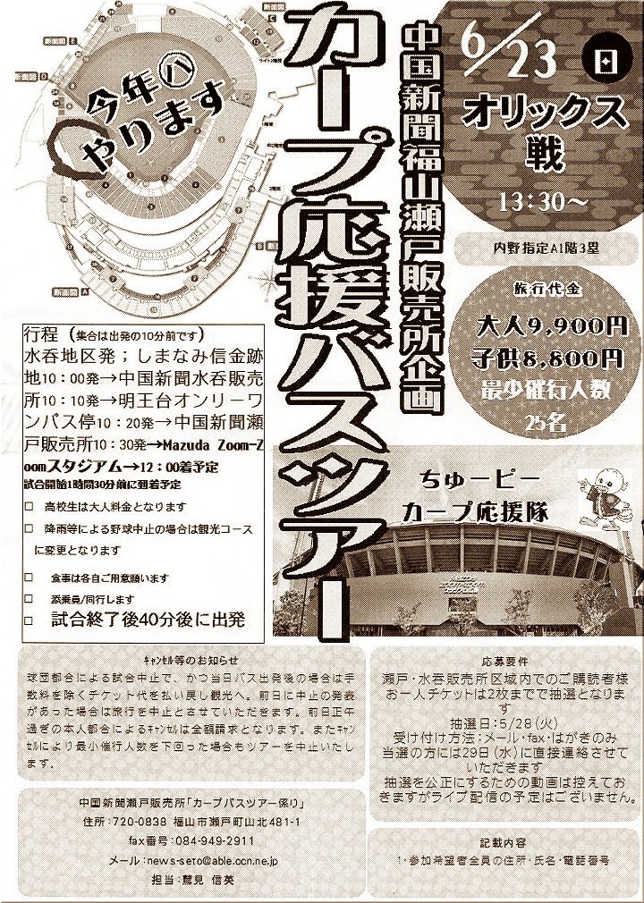 これは、今朝の中国新聞折り込みチラシなのですけど、ふ〜ん、「カープ応援バスツアー」参加者の募集ですか…