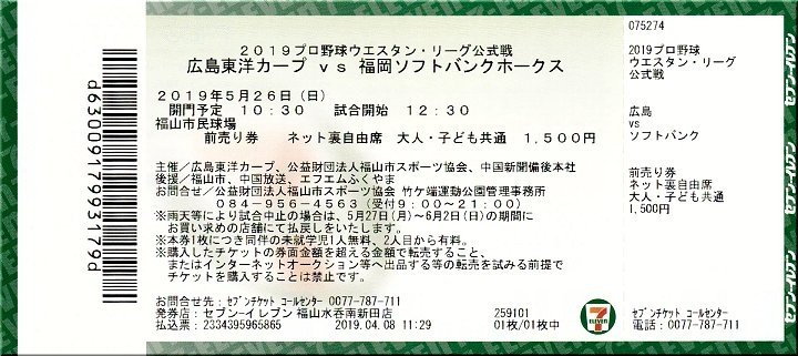 「広島東洋カープvs福岡ソフトバンクホークス」戦のチケットは既に入手済みで、観戦を予定しております。