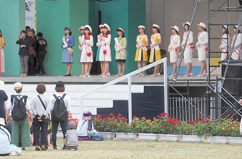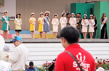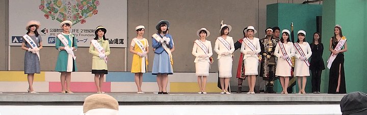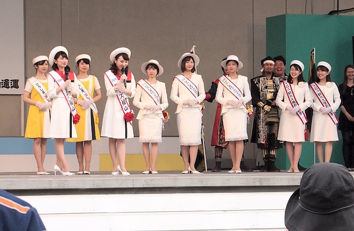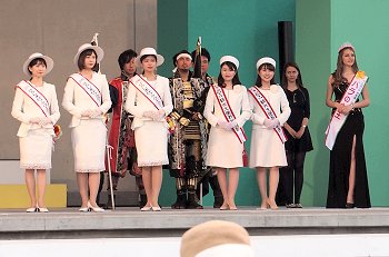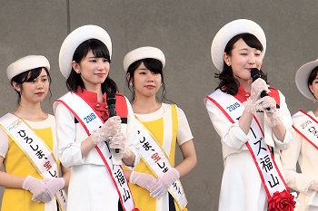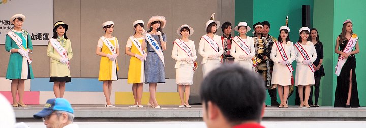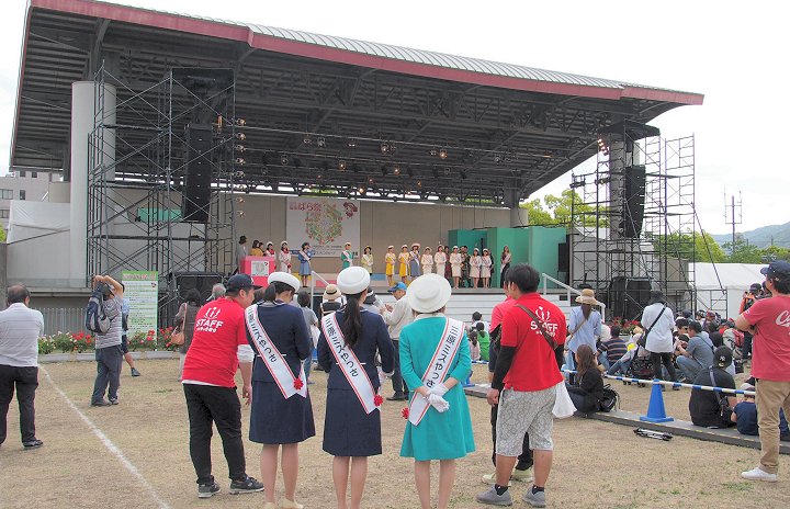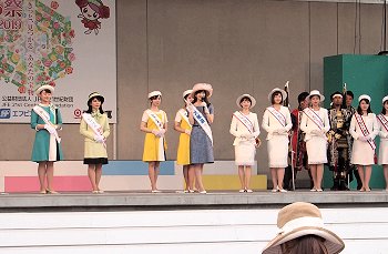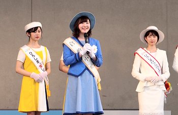 野外ステージに向かってみますと、パレードを終えたばかりのミスの皆様が、各地の観光アピールを(^_^)v