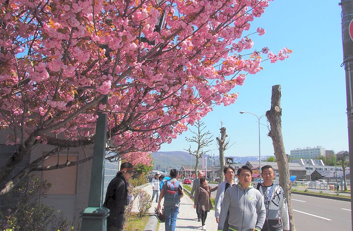 暫く小樽運河と、その周辺をノンビリと散策しておりまして、満開の八重桜にカメラを向けておりましたら、研修旅行のメンバーの3名の方が、こんな時間にヤッて来られました。