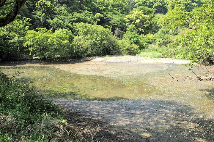 六方学園下の池に到着しますと、いよいよ山歩きがスタートです。降雨量が少ないせいか池にはほとんど水がありません。