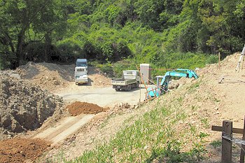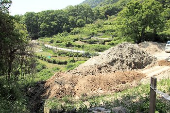 工事中の溜め池の向こうには段々畑も視界に入ります。