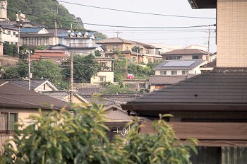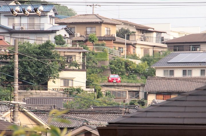 が、その時間帯には、正面の白萩団地方向の建物の上の赤い車が眼に入ります(^-^)