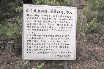 孝霊塚の下側には、「孝霊天皇御陵、寳筐印塔(ほうきょういんとう)、石人」案内表示板が…