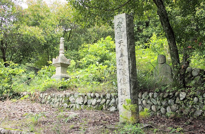 備陽六郡史に「神宮寺上に古き寳筐印塔有、是を孝霊帝の御墓といひ傳う、其の後に圖のごとくに山有、是陵ならんか」と記されています。(圖とは、この文の前に掲載されている地南宮神社 神宮寺一帯を書いた地図でその中に孝霊帝御墓がありそこに小山が書かれている。)