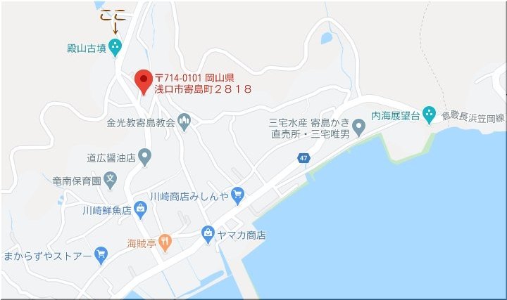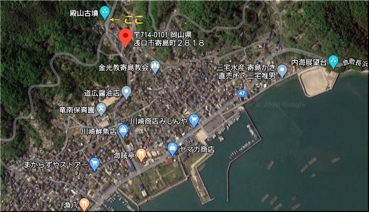 現浅口市寄島町、海沿いを走る県道47号から県道284号を北に曲がって500m程、道路が大きく右カーブする辺りの正面畑の中にすっかり露出した石室が見えています。羨道壊失玄室も前部を失っているようです。内部はかなり埋もれと言うより埋もれていた土砂を掻き出したのかもしれなくて奥の方がより埋まり奥壁が僅かに見えている程度です。天井石2枚の内奥の方が一段下がっている。畑の中、内部は何かが祀られ古墳犬がうるさく吠えるので早々に退散しました。県道脇に駐車スペースあり。