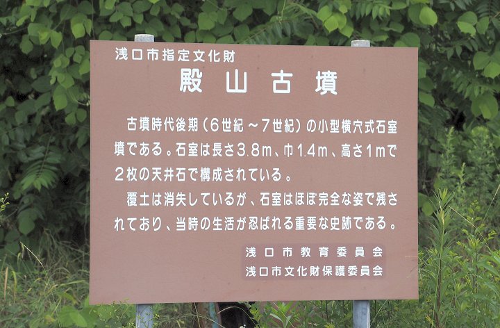 県道284号東安倉鴨方線にそって寄島から鴨方へ向かう途中、安倉八幡社をすぎて上りスローが始まる処に殿山古墳が見えてくる。この古墳は現地説明板によると6〜7世紀に作られたもので石室の長さ3.8m、幅1.4m、高さ1m、二枚の天井石の構成、覆土は焼失しているが石室はほぼ完全な姿で残っている…と書かれていた。