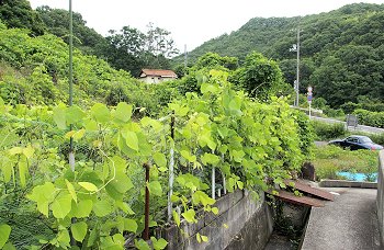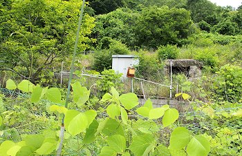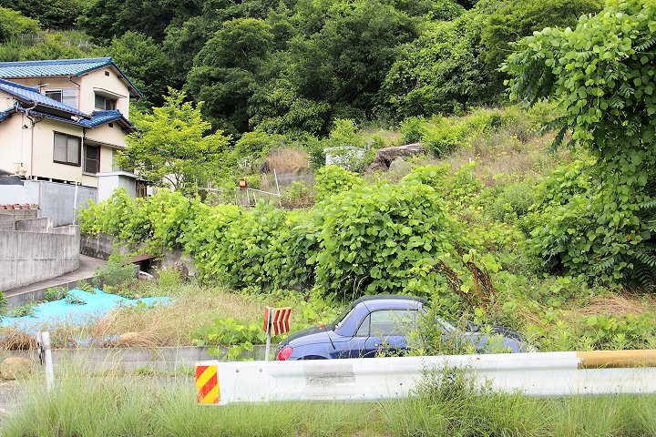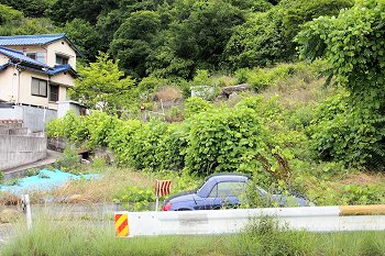 多分、この側溝に2枚の鉄板が敷いてある場所が進入路なのでしょうけど、葉っぱが生い茂っておりまして、おまけにフェンスというかネットが張ってありまして、とても入れそうにはありません(^-^;