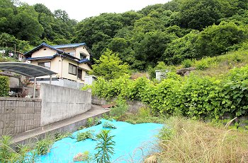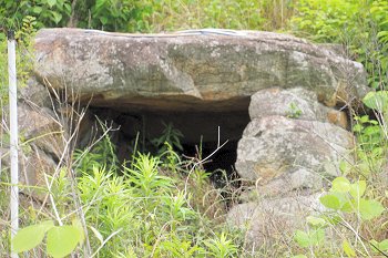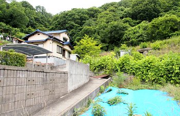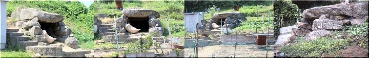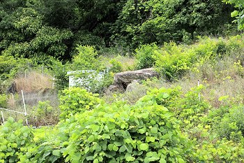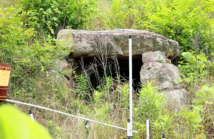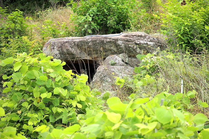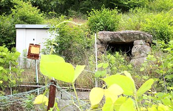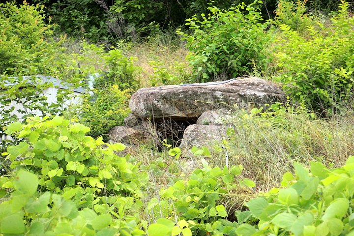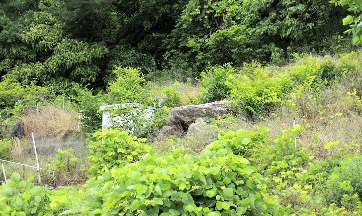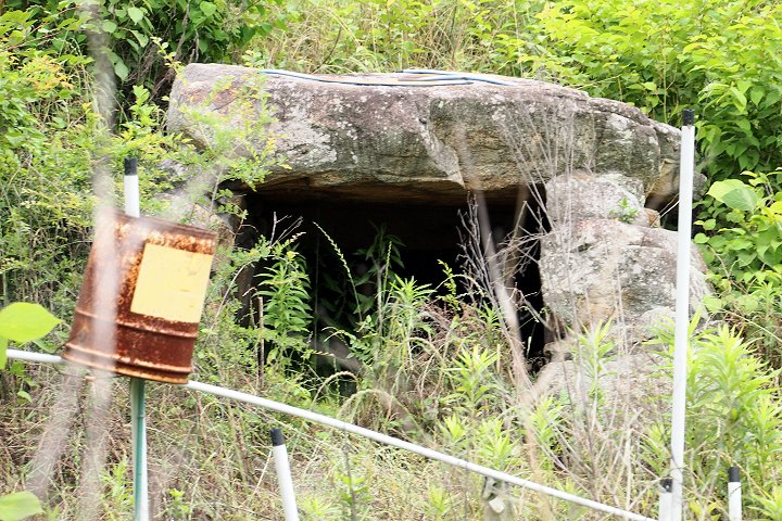 道から見える古墳です。家の庭にある古墳で、石室が露出しています。古墳をよく見てみると、コンクリートで補強してあったり、物が入れてあったりしていました。