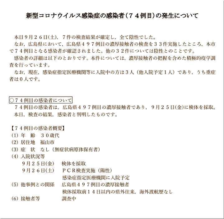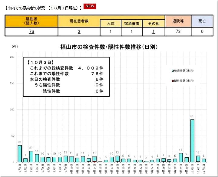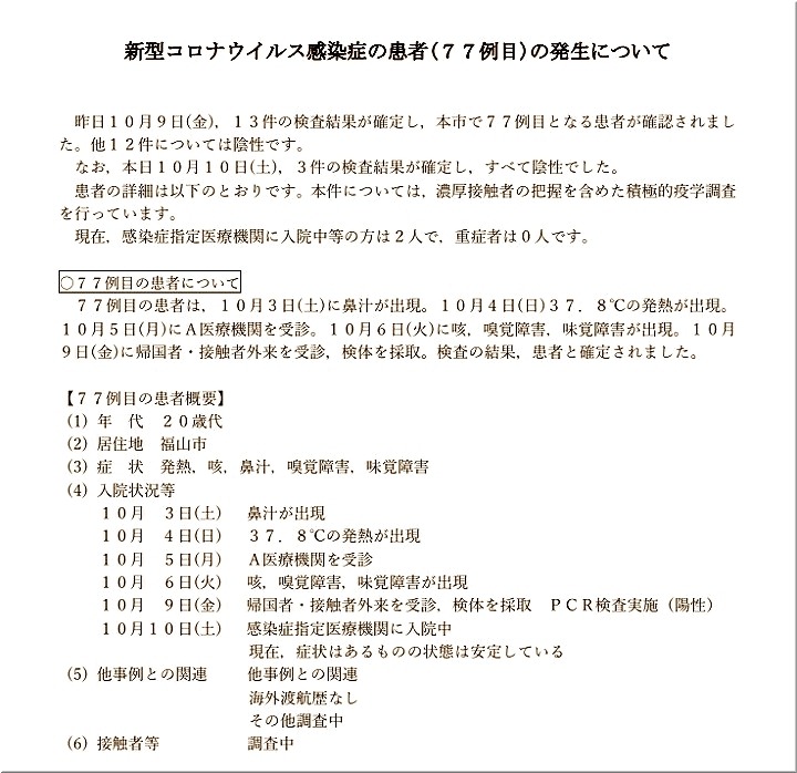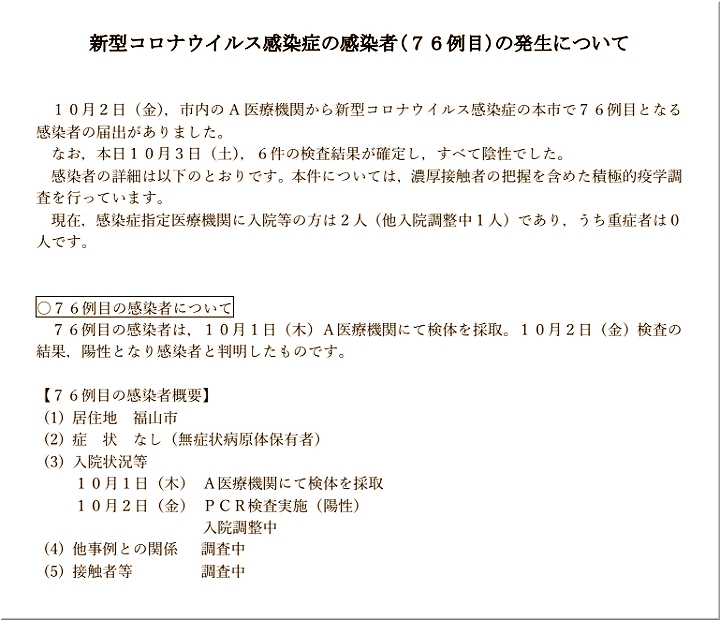 福山市で昨日(10/2)、76例目の感染者が発生しましたようです…