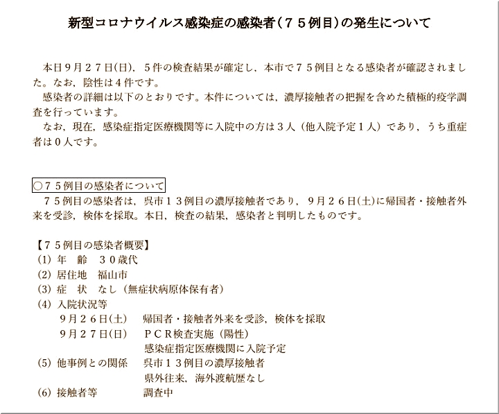 感染源は、呉市13例目の濃厚接触者との事のようです。これで、福山市は75例目の感染者となりますネ。
