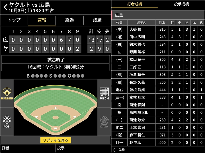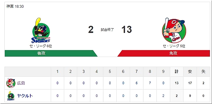 昨夜の「広島×ヤクルト」戦…終わってみれば大差で\(^o^)/