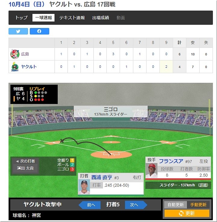 9回裏 ヤクルト 代打 西浦 直亨 一死1、2塁 バッター 井野 に代わり、西浦 1アウト1、2塁の3-2からレフトへのタイムリーヒット ヤ1-13広 1、2塁