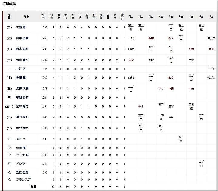 ・本塁打 -- 広島 長野 6号(7回表ソロ)、大盛 1号(7回表3ラン)、松山 7号(7回表2ラン)