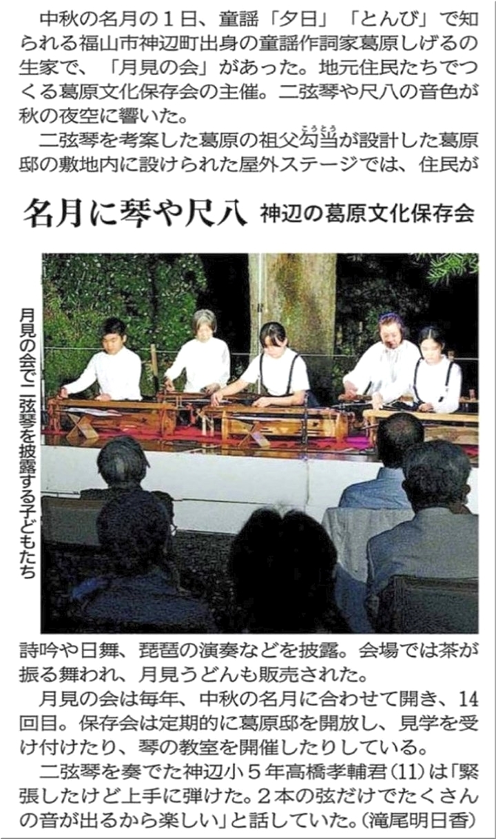 先程は、お疲れ様でした。10月2日の中国新聞に、葛原のお月見会の記事が写真付きで載ったのですが、子供たちも3人だけ、大人も高齢者と病人が増えて淋しい限り。