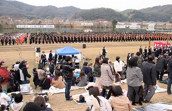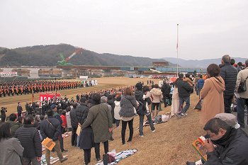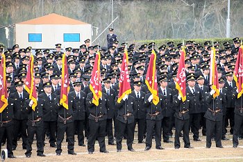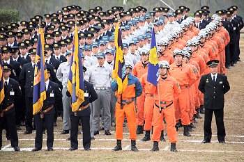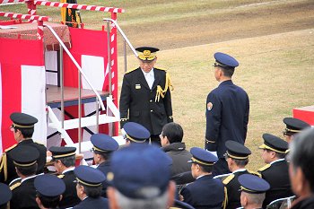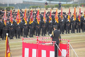 徒歩部隊・車両部隊の分列行進が終わりますと、国旗掲揚・黙とう・式辞・訓示・表彰…と、続きます。