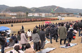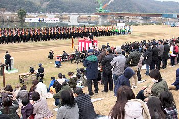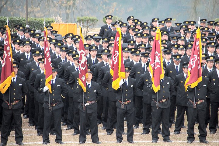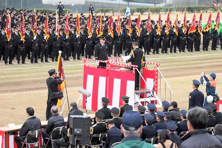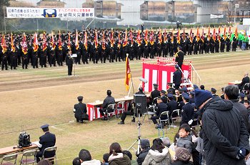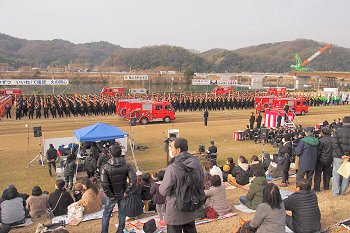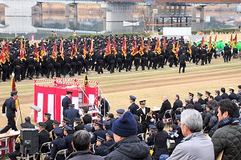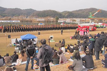 こんな感じで式典が終わりますと、皆さんお待ちかねの演技披露・公開訓練と続きますけど、この時間帯になりますと観客も随分増加。毎年、この演技披露・公開訓練を楽しみに出初め式見物でヤッて来られる方々も多いのでしょうねぇ〜