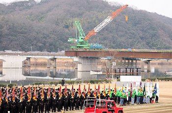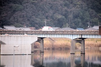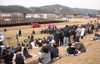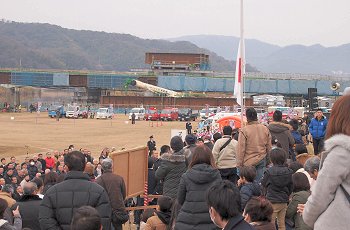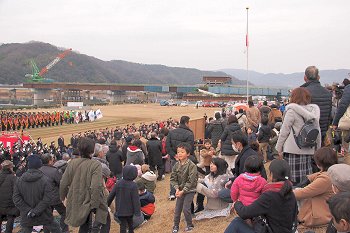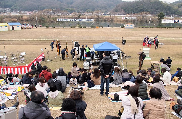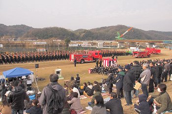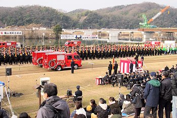 式典の最中に、一台の救急車が草戸大橋を急行です。出初め式に参加しておられません方々は日常業務に従事ですから、出初め式会場近くを救急車が走行も決して不思議でもありませんけど(^-^)