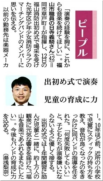 出初め式演技披露で、光学区少年少女消防クラブのマーチングバンドの指揮を執っておられました男性…この方は学校の先生なんだろう…と思っておりましたら、本日の中国新聞朝刊紙面に、この方の記事掲載が(^.-)☆