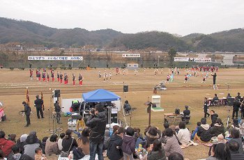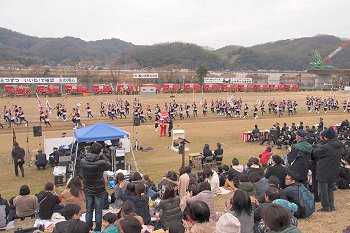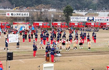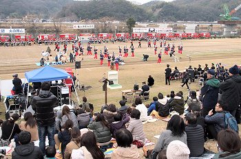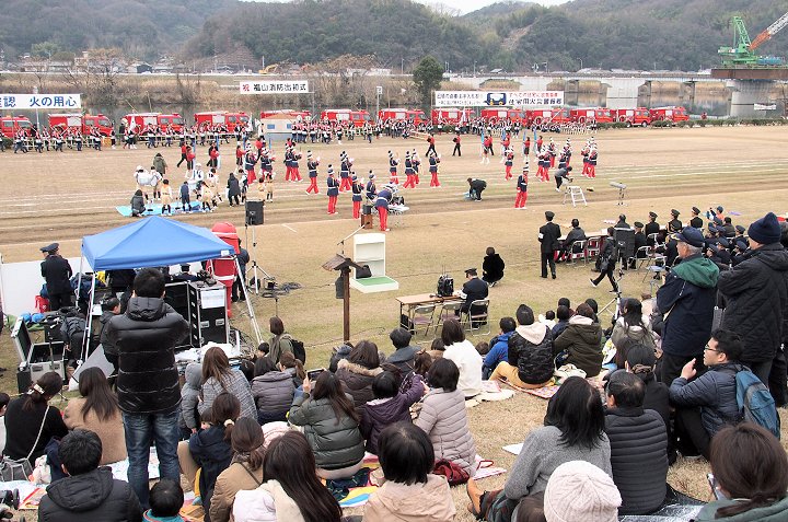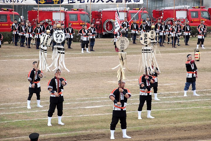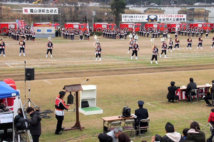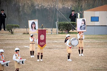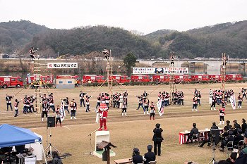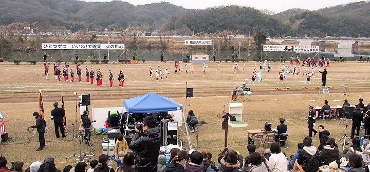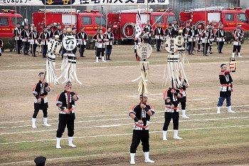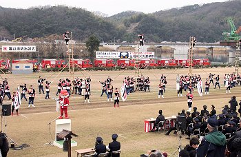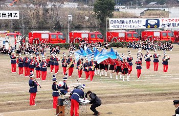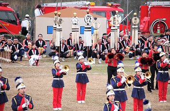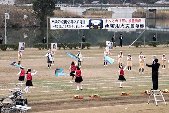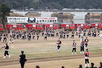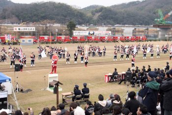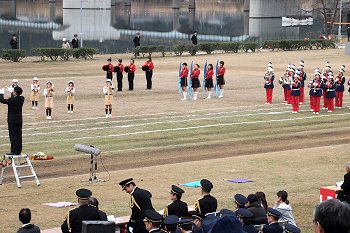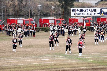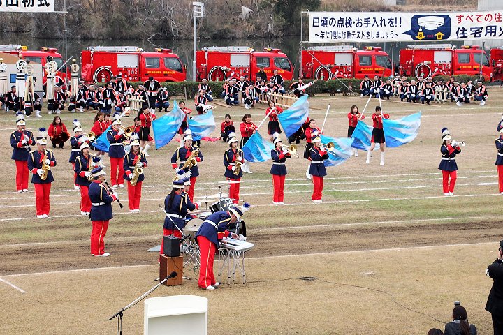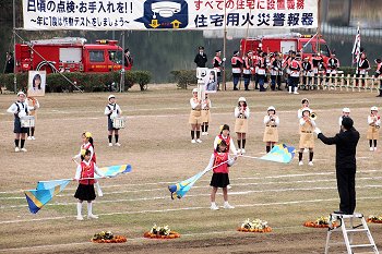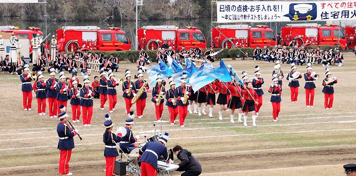 演技披露では、まず、光学区少年少女消防クラブの皆さんのマーチング。そして、消防音楽隊・女性分団・カラーガード隊のマーチングと続きます。