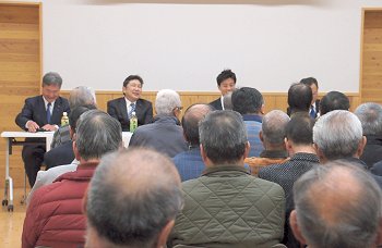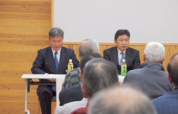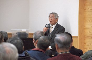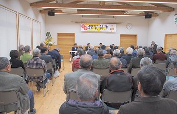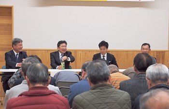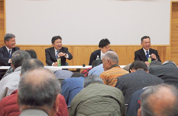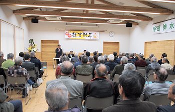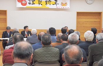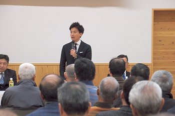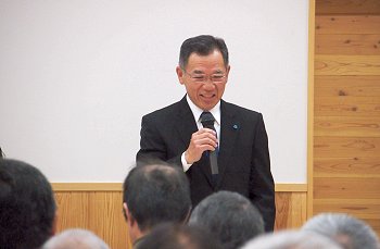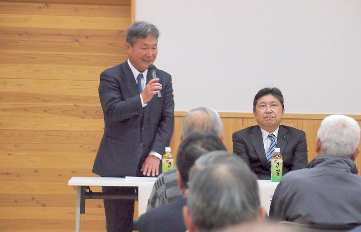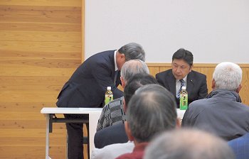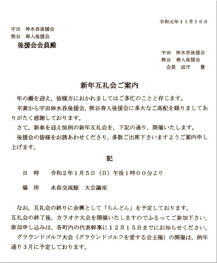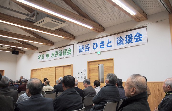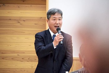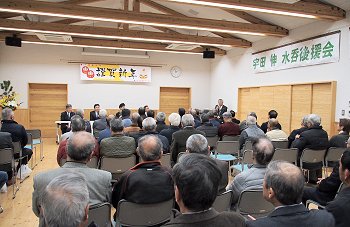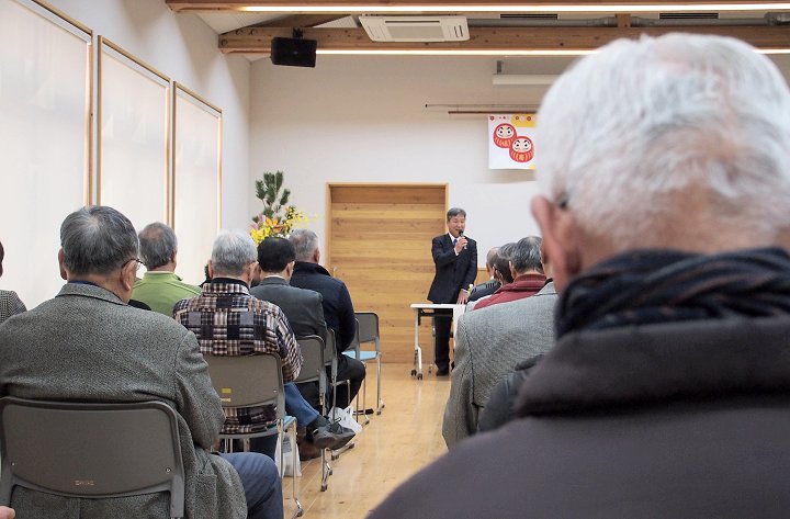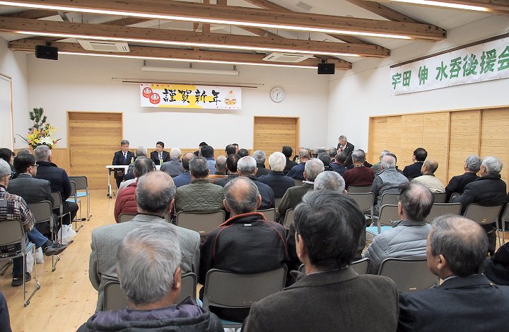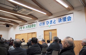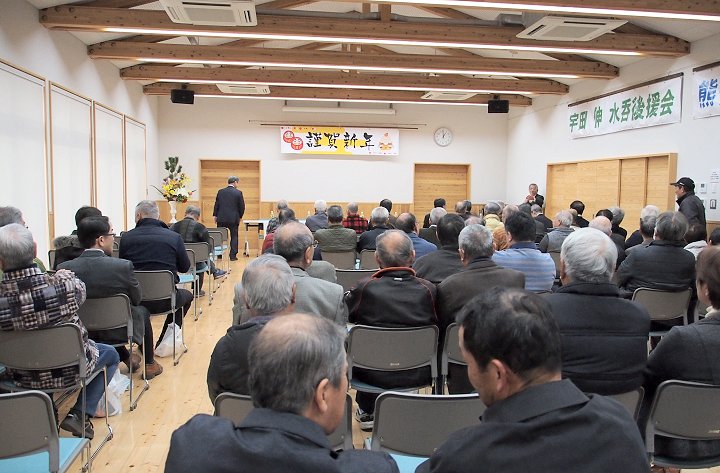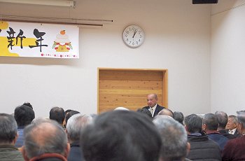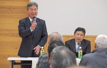 定刻に互礼会は始まりまして、まずは「宇田伸・水呑後援会」「熊谷寿人・後援会」両後援会長会長・田守sanのご挨拶。