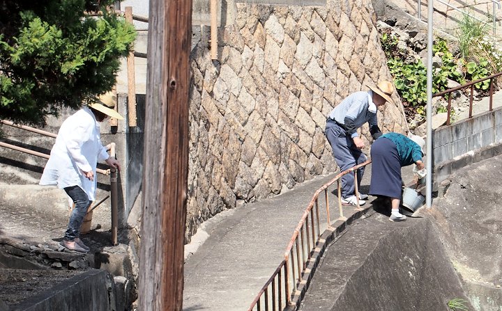 バケツの水を流しておられるのか、それとも何かを洗おうとしておられますのか…