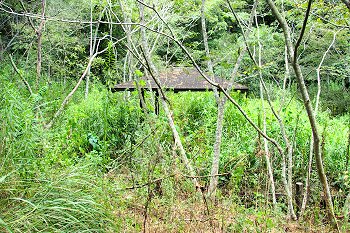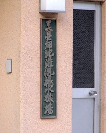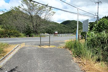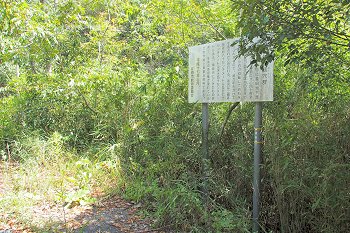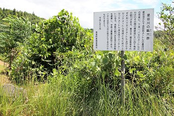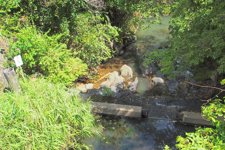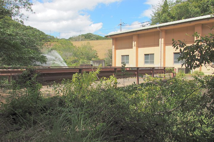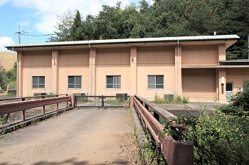 土手の下には管理棟(美星畑地灌漑揚水機場)の建物が…そして、この建物に渡ります橋の下に『唐川甌穴』の案内表示板が…