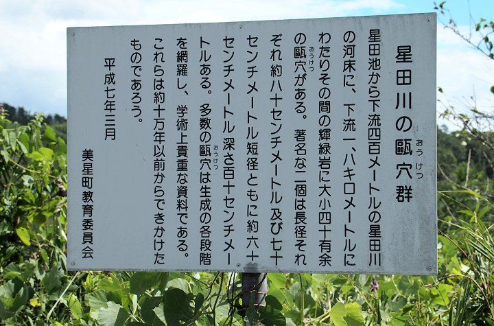 星田池から下流400mの星田川の河床に、下流1.8kmにわたりその間の輝緑岩に大小40有余の甌穴がある。著名な二個は長径それぞれ約80cm及び70cm短径ともに約60cm深さ110cmある。多数の甌穴は生成の各段階を網羅し、学術上貴重な資料である。