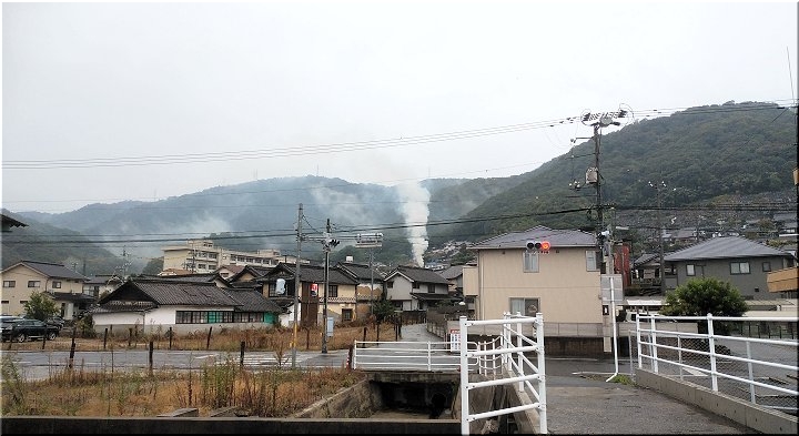 なのに、正面方向の水呑小学校後方辺りから、風がありませんから真っ白い煙が真っ直ぐに上がっておりました。こんな雨の中で、何を燃やしておられますのでしょうねぇ〜