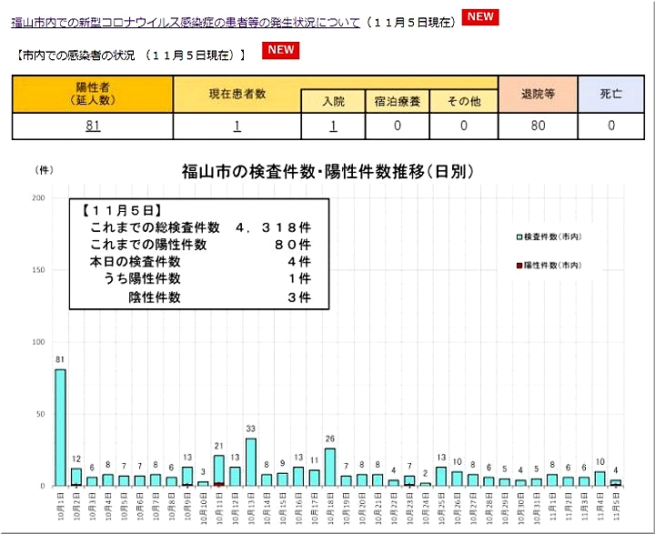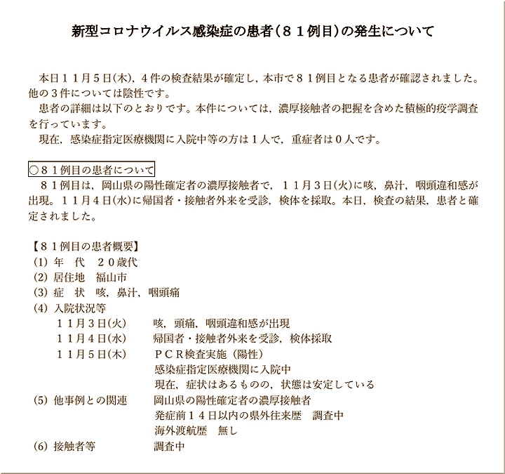 福山市で昨日(11/5)、81例目のコロナ感染者が確認されましたようです…