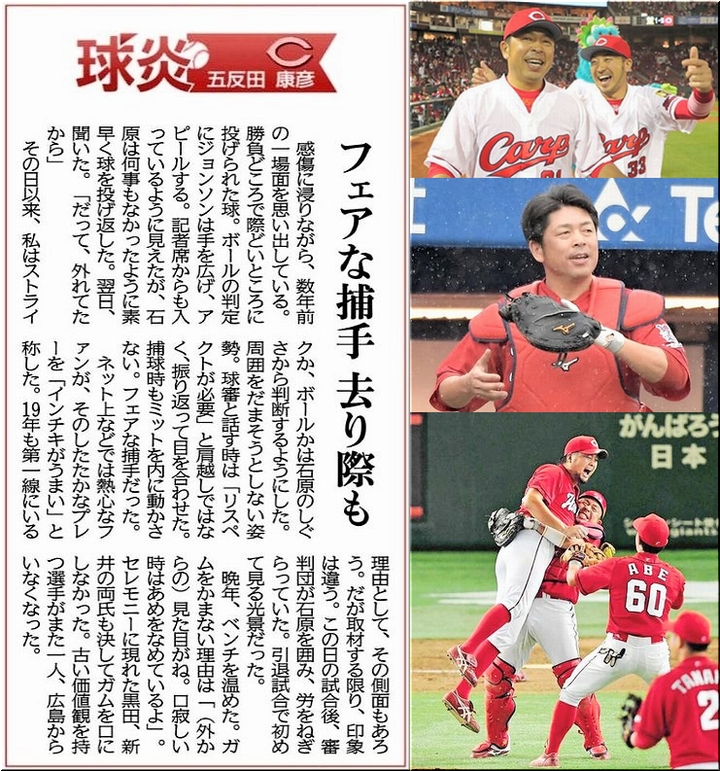 そぅしましたら、今朝の中国新聞sanに、こんな大変興味深い記事掲載が(^_^)v『フェアな捕手 去り際も』…