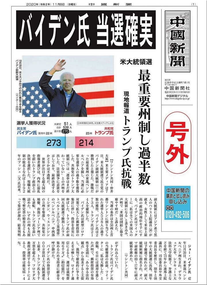 これは、本日の中国新聞sanの号外ですけど、米大統領選…ヤッと「当確」が出ましたようですネ(^.-)☆