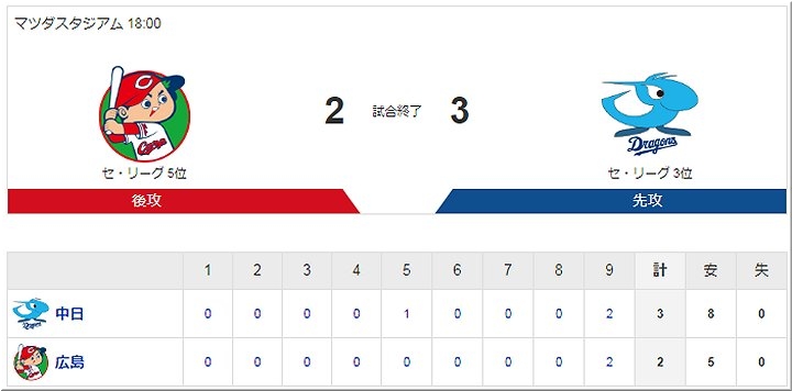 中日は5回表、京田の適時打で先制する。そのまま迎えた9回には、桂が2点適時打を放ち、貴重な追加点を挙げた。投げては、先発・柳が9回途中2失点の快投。最後は2番手・藤嶋が締め、プロ初セーブを挙げた。敗れた広島は、打線が最終回に1点差まで迫るも、あと一歩及ばなかった。