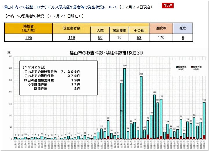 本日午前中の中国新聞sanの速報通り、本日(12/29)は福山市で17名のコロナ感染者が確認されました。