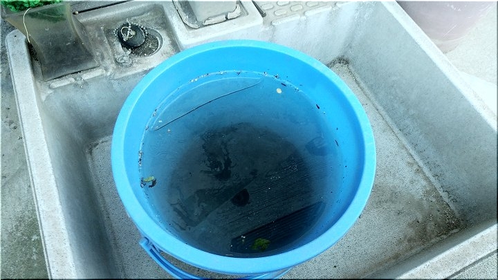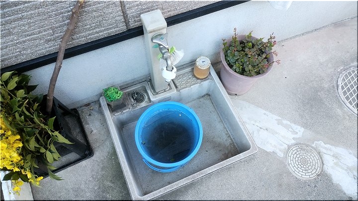 あまりの気持ちよさに、とりあえず一枚パチリ。そして、その後で我が家の軒下のバケツに眼を向けましてビックリ(^-^;